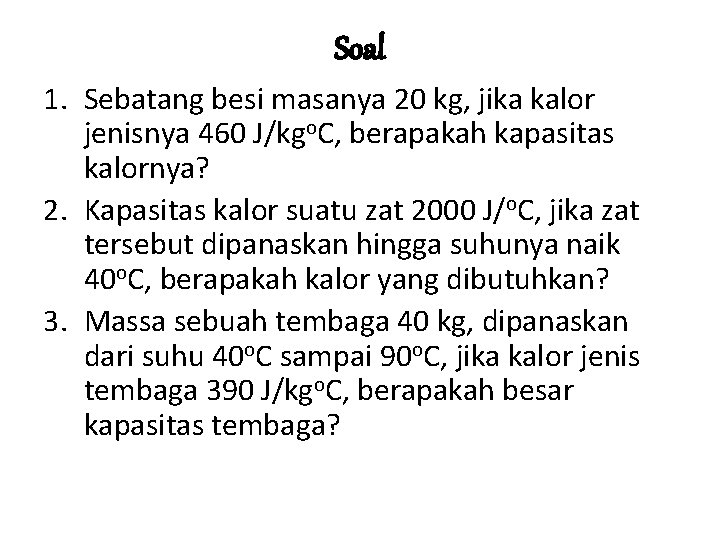Silahkan kunjungi postingan pengertian dan rumus kapasitas kalor serta contoh soal kapasitas kalor dan pembahasannya untuk membaca artikel selengkapnya. Kamu dapat download modul & contoh soal serta kumpulan latihan soal kapasitas kalor dan sistem fasa dalam bentuk pdf pada link dibawah ini:. Q = (2 × 103 g)(1 kal/goc)(50oc). Berapakah kapasitas kalor dari 5 kg suatu zat yang mempunyai kalor jenis 2 kal/goc? Kalor merupakan salah satu bentuk energi yang .